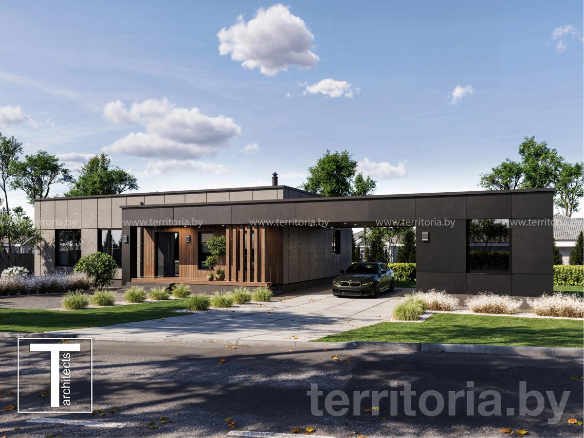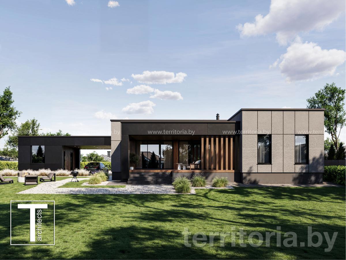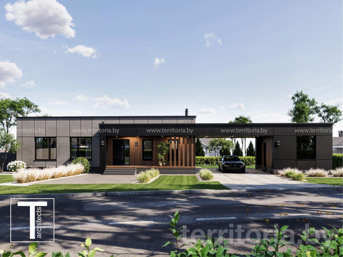 Проект одноэтажного дома с навесом и хозблоком BERGEN KZ