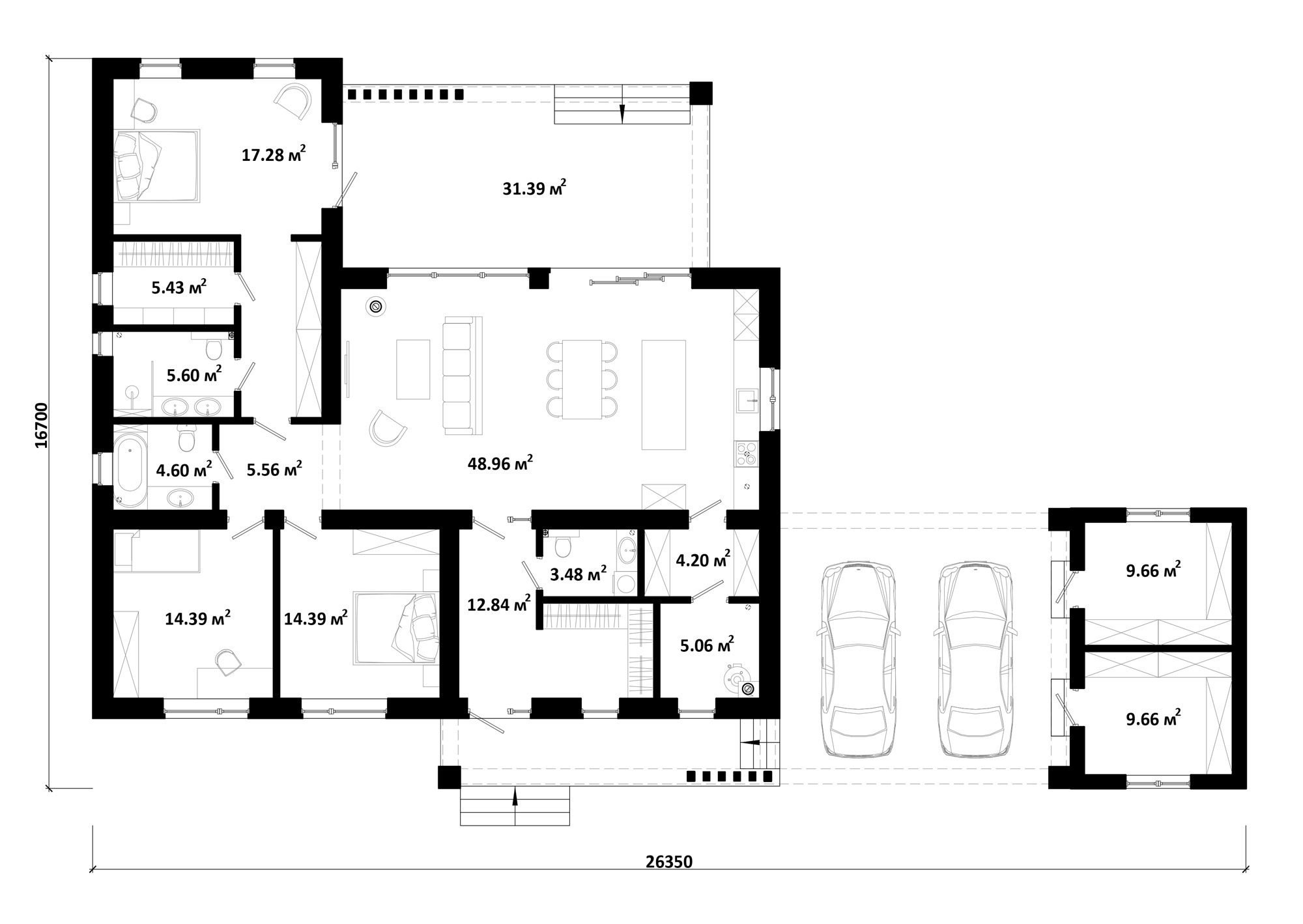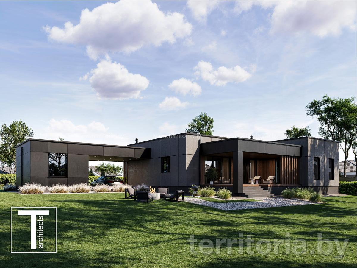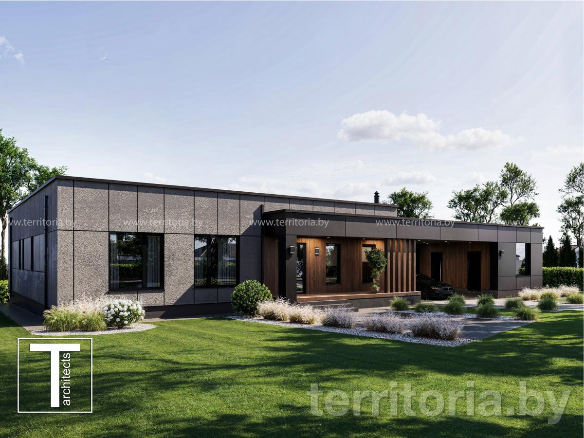 Проект одноэтажного дома с навесом и хозблоком BERGEN KZ