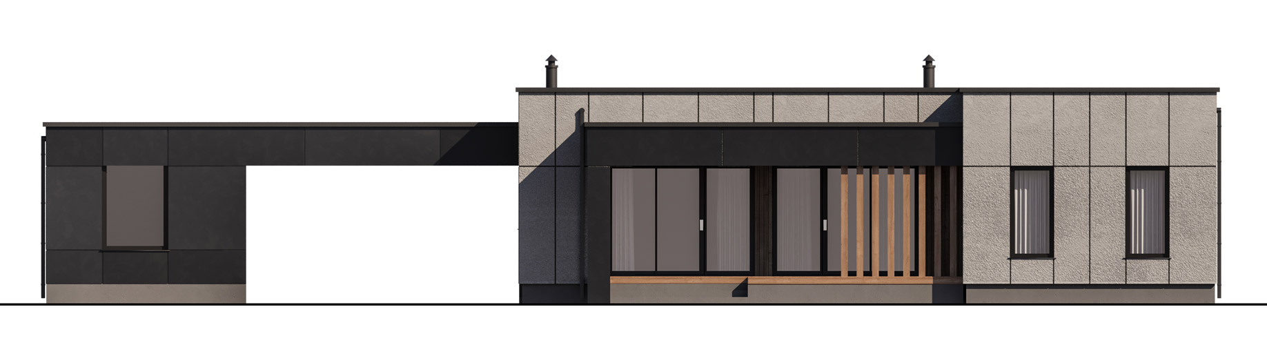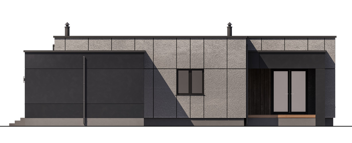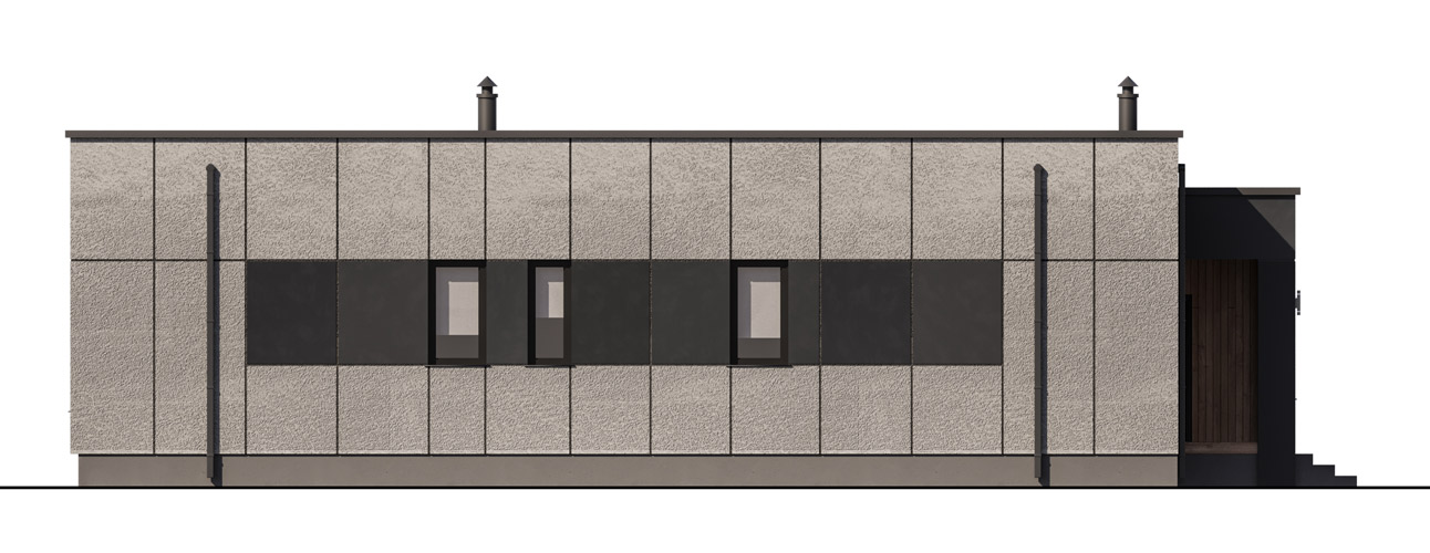 Представляем вам еще одну версию популярного проекта одноэтажного дома с плоской крышей - в этот раз с пристроенным хозяйственным помещением. Многие наши клиенты-застройщики спрашивают - как можно предусмотреть какое-нибудь помещение для хранения садового инвентаря, газонокосилок, генераторов, резины и велосипедов? И вот к этому дому мы “додумали” вот такую пристройку в виде помещения разбитого на 2 комнаты (при желании можно объединить). Получилось очень функционально!
