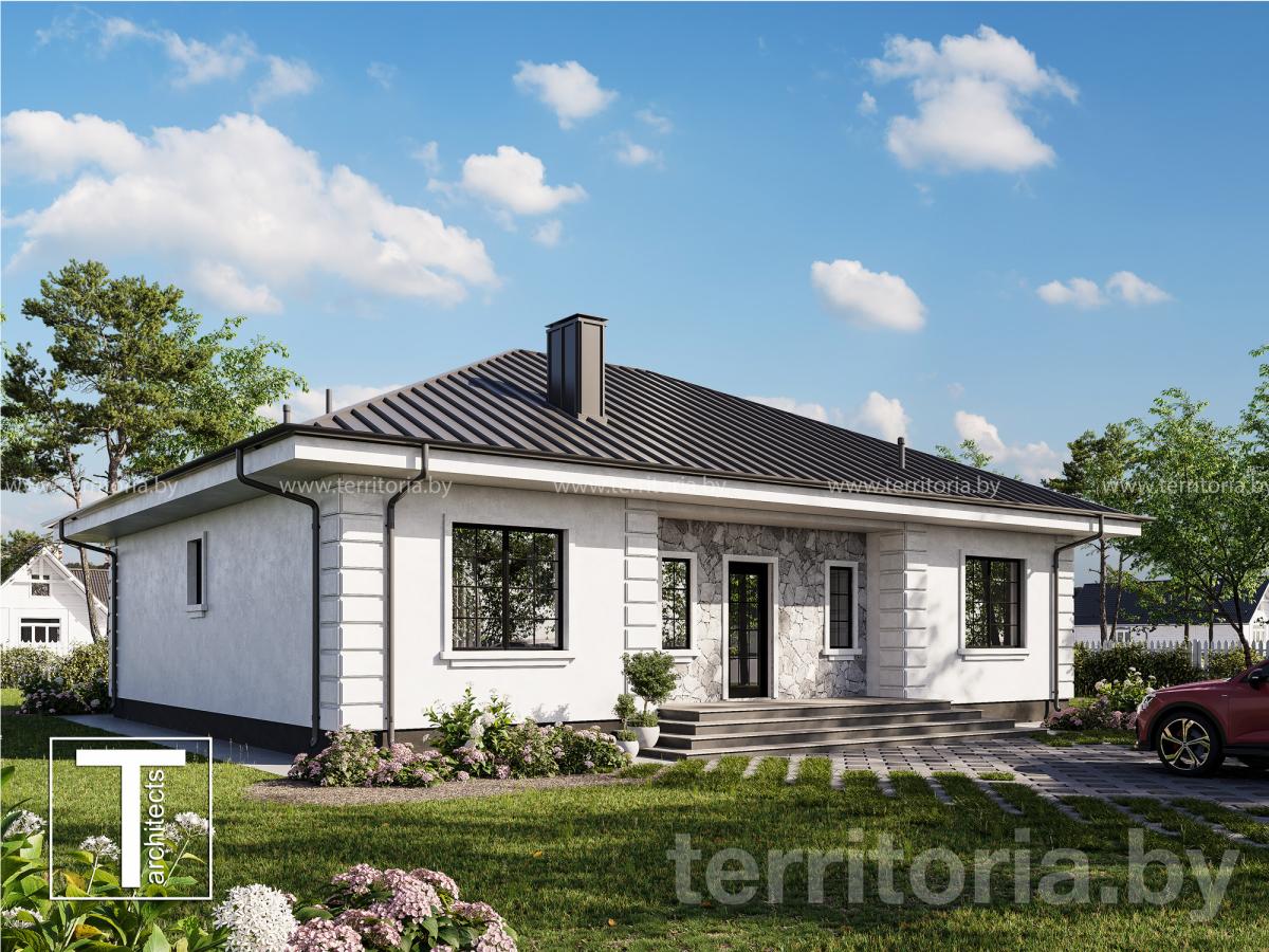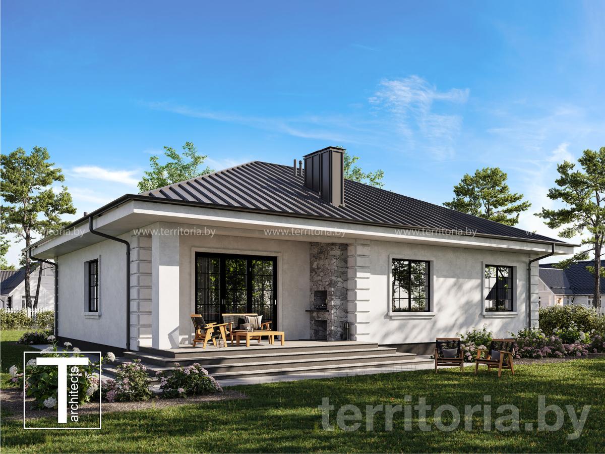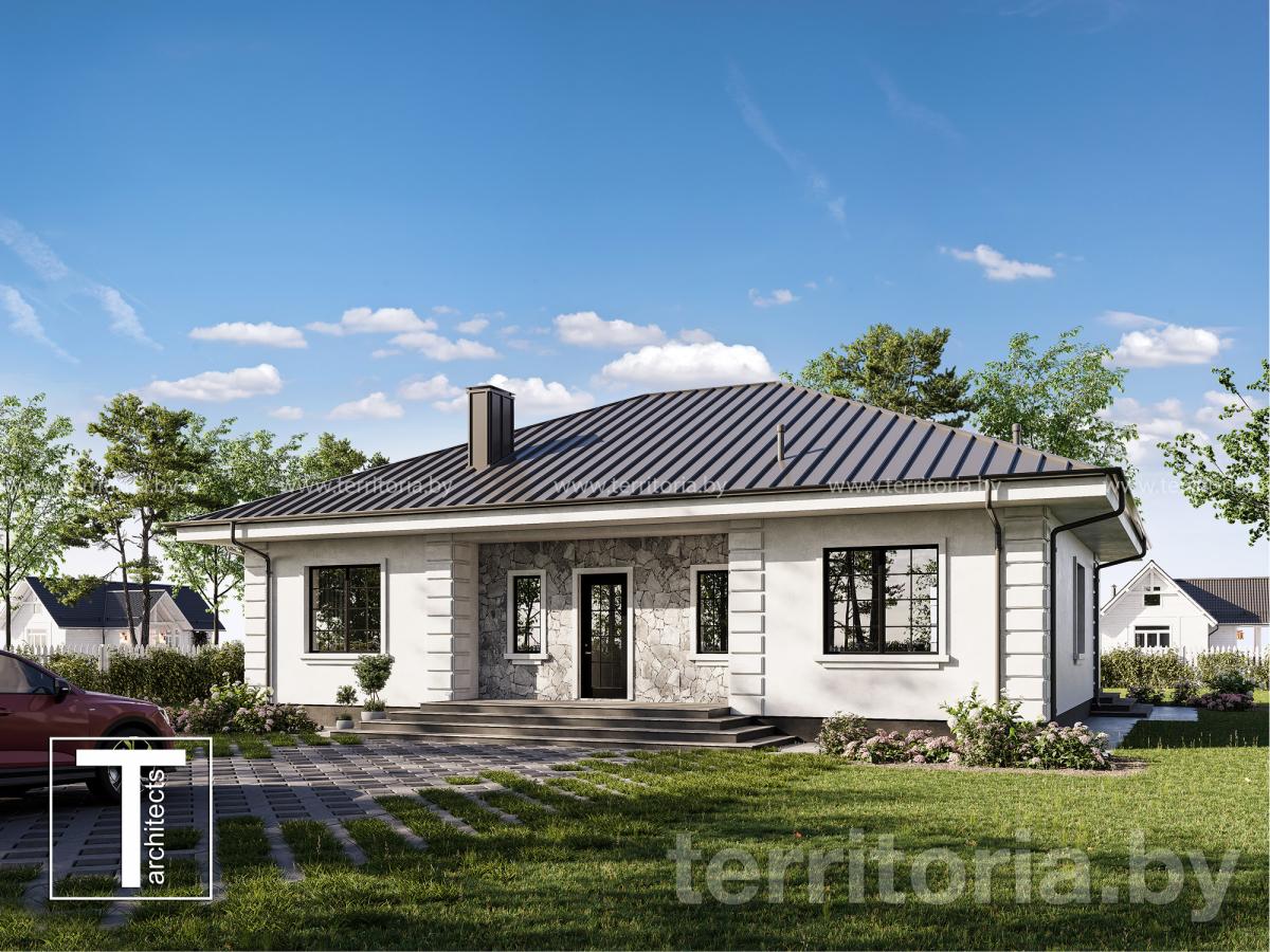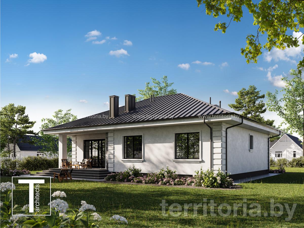 Один из самых популярных проектов одноэтажных домов без гаража. Простая геометрия и использование отечественных материалов снижают затраты на строительство до минимума.